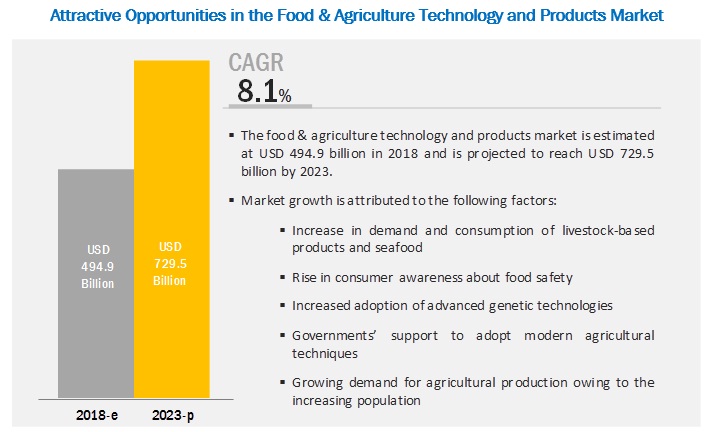 The global food & agriculture technology and products market size is projected to grow from USD 494.9 billion in 2018 to USD 729.5 billion by 2023, at a CAGR of 8.1% during the forecast period. The increase in demand and consumption of livestock-based products and seafood, rise in consumer awareness about food safety, governments’ support to adopt modern agricultural techniques, and demand for agricultural production due to the increasing population are some of the major drivers for the growth of the food & agriculture technology and products market.