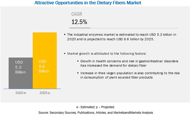 According to MarketsandMarkets, the dietary fibers market is estimated to be valued at USD 5.3billion in 2020 and is projected to reach USD 9.6billion by 2025, recording a CAGR of 12.5% in terms of value. Due to thegrowth in the vegan population and alignment of consumers toward healthy lifestyles is going to drive the market.