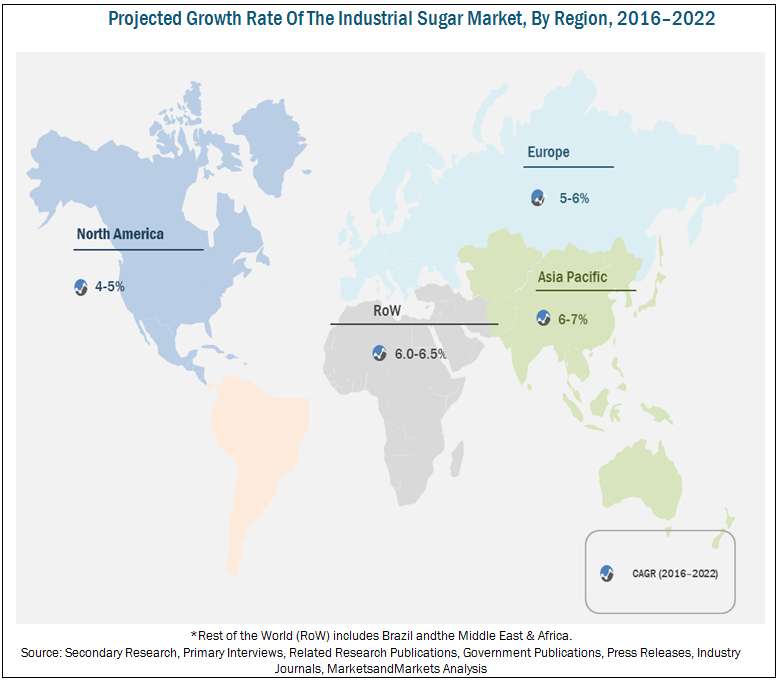 Asia Pacific is estimated to account for the largest market share in the industrial sugar market, in terms of value, in 2016, dueto the presence of major players in the region and the increase in disposable income of consumers. Developed markets, such as North America and Europe, have reached the mature stage, and thus, offer growth opportunities for manufacturers in developingregions,including AsiaPacific. The growth of the industrial sugar market in the AsiaPacific region is driven by untappedapplication segments and increasing population. The increase in the consumption of consumer products and the rise in demand for packed food products are the key factors that drive the demand for sugar products in regions, such as Europe and North America.