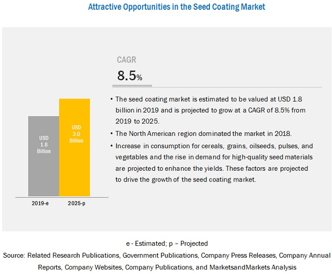 The report “Seed Coating Market by Additive (Polymers, Colorants, Pellets, Minerals/Pumice, Active Ingredients), Process (Film Coating, Encrusting, Pelleting), Active Ingredient (Protectants and Phytoactive Promoters), Crop Type, Region – Global Forecast to 2025″, is projected to grow at a CAGR of 8.5% from USD 1.8 billion in 2019 to reach a projected value of USD 3.0 billion by 2025. The quality, appearance, and nutritive value of seeds are the key factors contributing to the growth of the seed coating market. Seed coatings offer help to raise the commercial value of seeds by enhancing their appearance, improved handling, flowability through planters, and making them more productive. Hence, seed coatings are projected to offer business opportunities for manufacturers in the next five years. Due to these factors, many multinational players are focusing on producing various types of seed coating products.