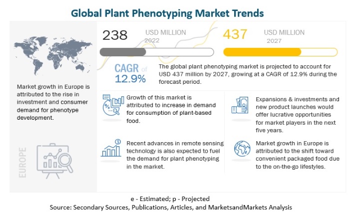 The global plant phenotyping market is on a trajectory to reach a staggering USD 437 million by 2027, showcasing a robust Compound Annual Growth Rate (CAGR) of 12.9% during the forecast period. This meteoric rise is propelled by a confluence of factors, including burgeoning expansions and investments in plant phenotyping within developed regions. Notably, the market is experiencing a surge due to the escalating importance of sustainable crop production through the cultivation of improved crop varieties.