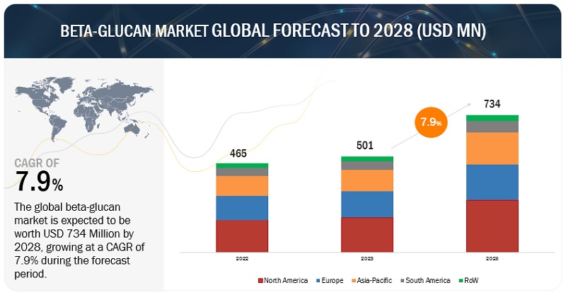 The beta-glucan market is poised for a remarkable surge, with estimations projecting a rise from USD 501 million in 2023 to an impressive USD 734 million by 2028, reflecting a robust CAGR of 7.9% during this period. Several factors contribute to this upward trajectory, including the escalating demand for natural food additives, the increasing utilization of beta-glucan in pharmaceutical formulations, and its pivotal role in enhancing emulsification in cosmetic products.
