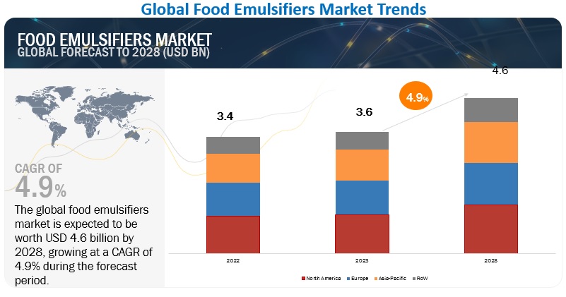The global food emulsifiers market size is estimated to be valued at USD 3.6 billion in 2023. It is projected to reach USD 4.6 billion by 2028, recording a CAGR of 4.9% during the forecast period. Some macroeconomic and microeconomic elements that have been prevalent in some important countries have had an impact on the global food emulsifiers market. In terms of value sales, this would be strong enough to significantly influence the market during the predicted period. The rise in consumption of convenience foods and bakery products, changing lifestyles, and consumption patterns drive the demand in the food emulsifiers market.