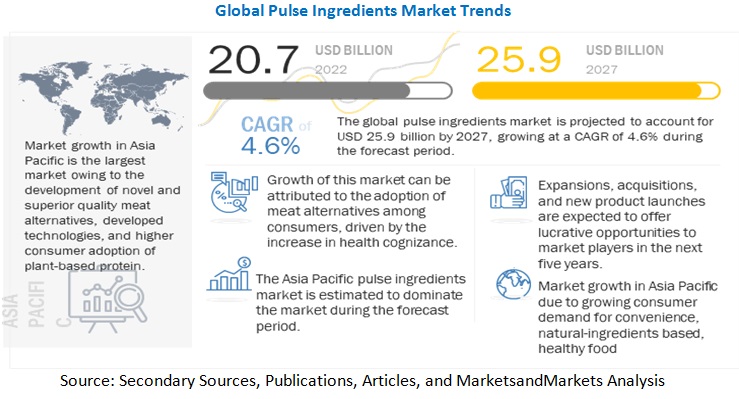 The global pulse ingredients market size, valued at USD 20.7 billion in 2022, is projected to reach USD 25.9 billion by 2027, recording a compound annual growth rate (CAGR) of 4.6% during the forecast period. Pulse ingredients, derived from peas, lentils, and chickpeas, are fine-powdered materials produced without processing aids or chemical compounds. These natural food and feed-grade products enhance the nutritional value of foods without altering their flavor, aroma, or color.