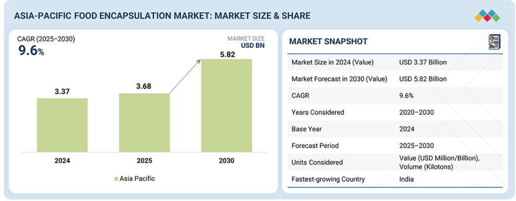 The Asia Pacific Food Encapsulation Market is projected to grow from USD 3.68 billion in 2025 to USD 5.82 billion by 2030, expanding at a Compound Annual Growth Rate (CAGR) of 9.6% during the forecast period. Food and nutrition companies across the region are increasingly adopting advanced encapsulation technologies to enhance ingredient stability, shelf life, bioavailability, and functional performance in food products. This technological shift is driving sustained market growth across applications, including functional foods and beverages, dietary supplements, infant nutrition, bakery, dairy, and confectionery products. Encapsulation enables controlled release, taste masking, and protection of sensitive ingredients from heat, moisture, and oxidation—making it a critical innovation platform for next-generation food formulations.