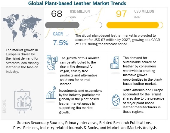 The global plant-based leather market will grow to USD 97 million by 2027, growing at a CAGR of 7.5% during the forecast period. The growing awareness about climate change and animal welfare and the resulting surging demand for sustainable, ethical, eco-friendly, cruelty-free, and clean products are encouraging designers, artisans, fashion brands, and automotive companies to shift from conventional leather and adopt strategies such as collaborations and partnerships with companies manufacturing plant-based leather.