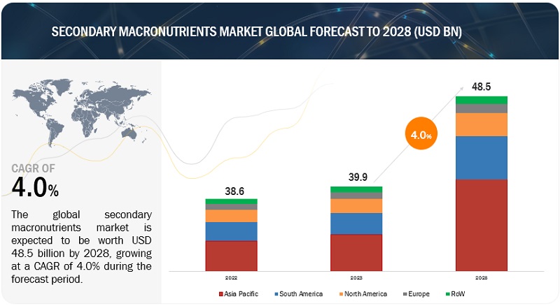 The global Secondary Macronutrients Market size is expected to record a CAGR of 4.0% from 2023 to 2028. In 2023, the market size is projected to reach a valuation of USD 39.9 billion. By 2028, the valuation is anticipated to reach USD 48.5 billion.